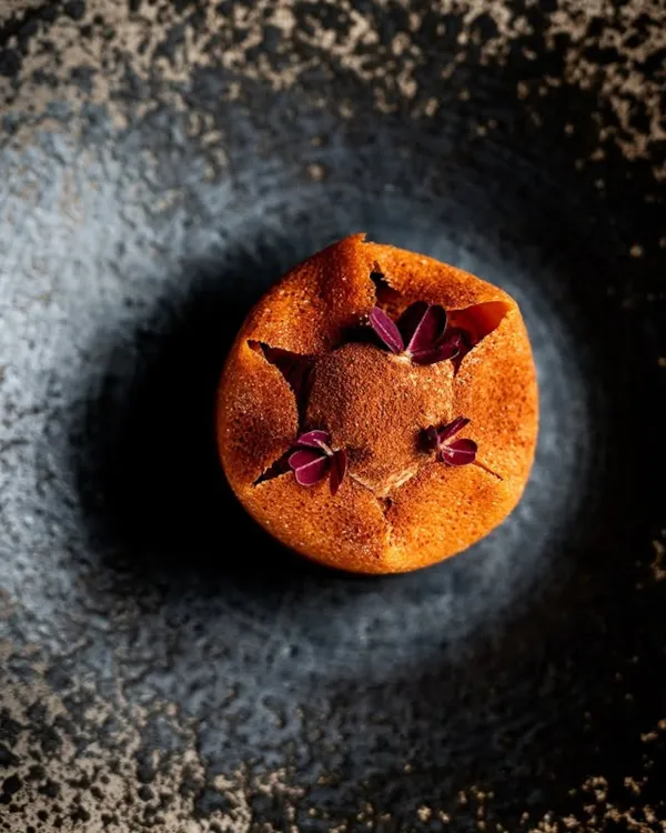 Jus corsé au pesto de cade, shitaké au vinaigre, crème glacée, pralin de cade et champignons