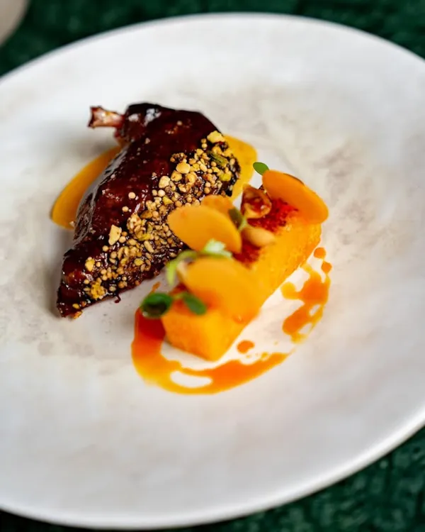 Aubergine confite à l’ail et raviole de cuisses et jus gourmand